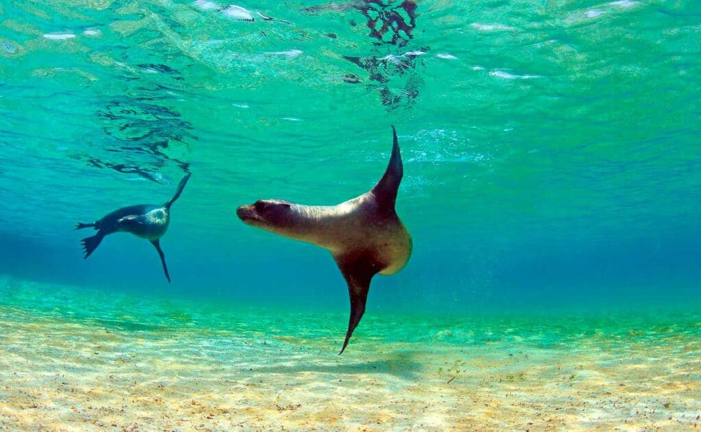 South Plaza Island, a masterpiece of evolution. Its dramatic cliffs, sculpted by wind and waves, create a stunning backdrop for a vibrant ecosystem. Land iguanas, unique to South Plaza, bask in the sun amidst carpets of vibrant succulents. The island's exceptional birdlife includes swallow-tailed gulls, red-billed tropicbirds, and the iconic blue-footed boobies engaging in their intricate courtship dance. Sea lions laze on the rocky shores, while the striking contrast between the turquoise waters and the island's reddish-brown terrain creates a breathtaking visual.