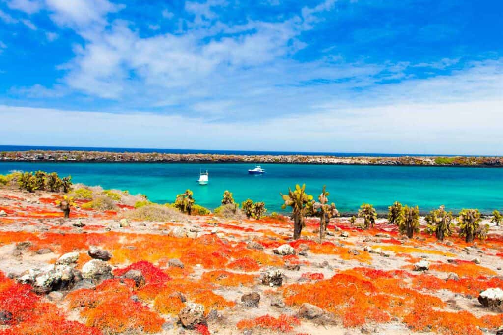 Santa Fe Island, with its pristine beaches and rich biodiversity. Its turquoise waters and sandy shores create a serene ambiance, providing an ideal spot for snorkeling with playful sea lions and encountering marine life. The endemic Santa Fe land iguana, characterized by its pale coloration and distinct features, roams freely. The island's towering Opuntia cacti and endemic Palo Santo trees showcase its unique flora. Santa Fe is a living testament to the Galápagos' ongoing ecological conservation, inviting visitors to connect with its natural wonders in a profound and responsible way.