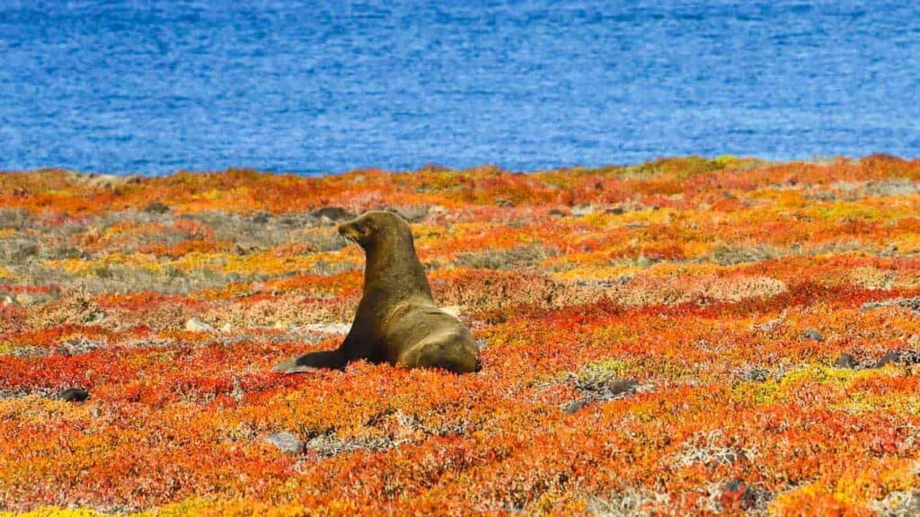 South Plaza Island, a masterpiece of evolution. Its dramatic cliffs, sculpted by wind and waves, create a stunning backdrop for a vibrant ecosystem. Land iguanas, unique to South Plaza, bask in the sun amidst carpets of vibrant succulents. The island's exceptional birdlife includes swallow-tailed gulls, red-billed tropicbirds, and the iconic blue-footed boobies engaging in their intricate courtship dance. Sea lions laze on the rocky shores, while the striking contrast between the turquoise waters and the island's reddish-brown terrain creates a breathtaking visual.