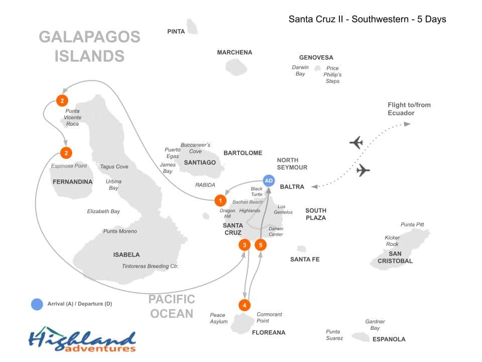 Santa Cruz' Highlands in Galapagos offer a unique natural landscape. Lush vegetation, giant tortoises roaming freely, and volcanic formations define this area. Explore lava tunnels, witness tortoise habitats, and discover the endemic flora and fauna.