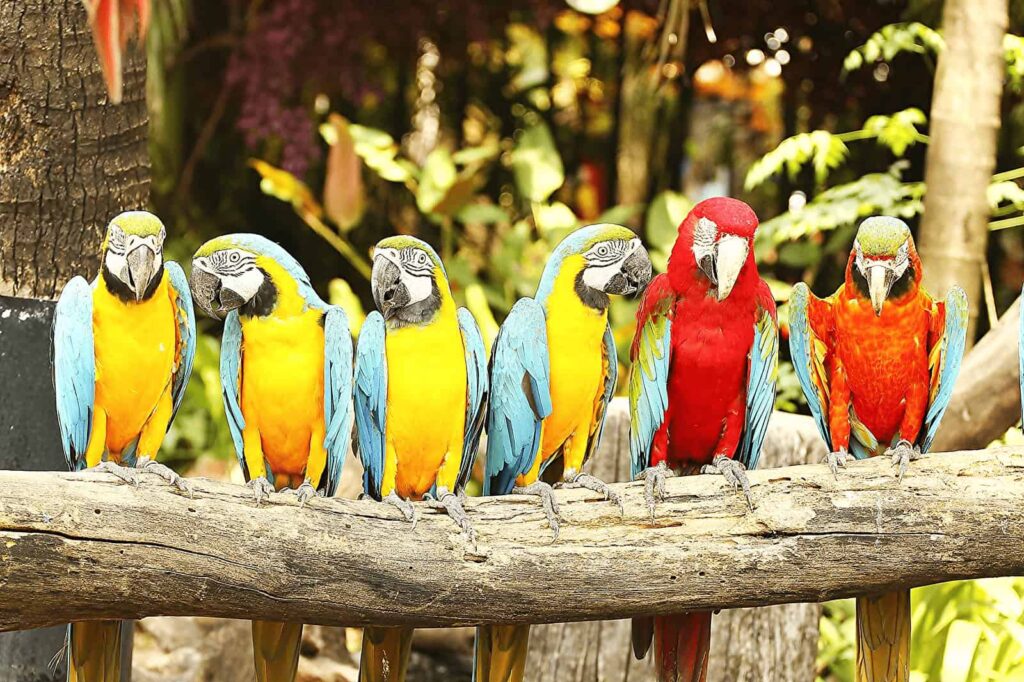 Amazon birds staying on a log.